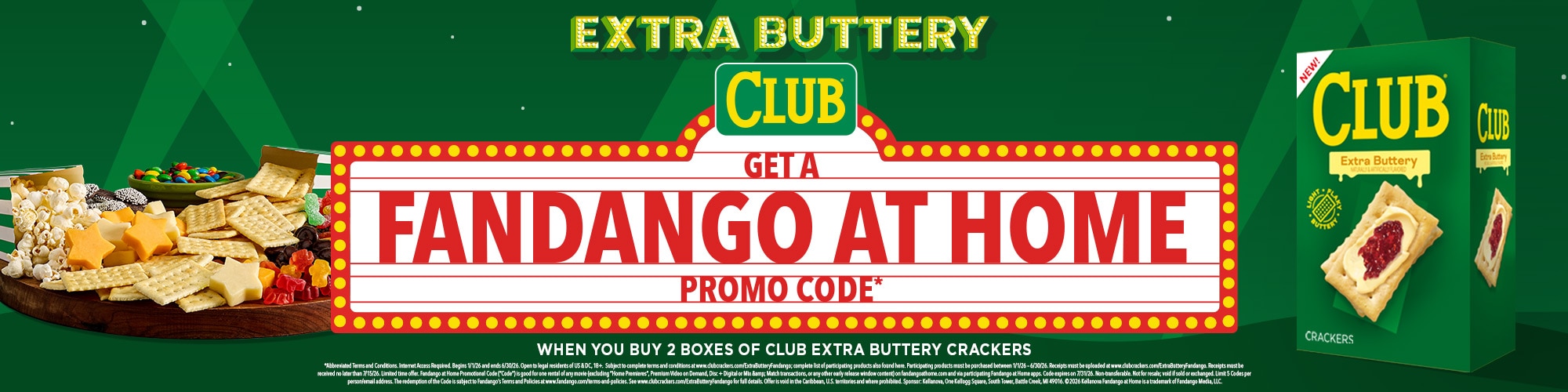 Get a Fandango At Home promo code when you buy 2 boxes of Club™ Extra Buttery Crackers.